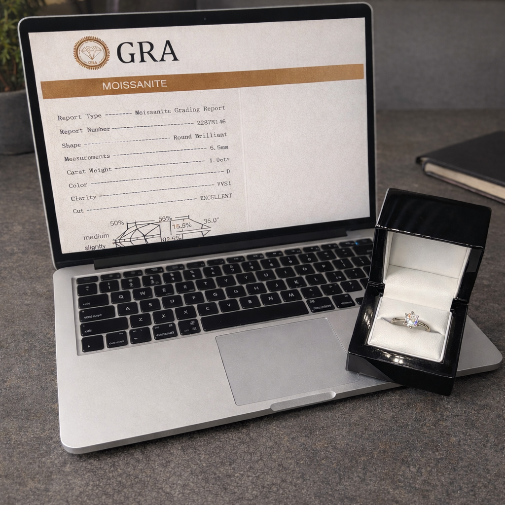 We offer engagement rings and fine jewelry featuring carefully selected moissanite gemstones, admired for their extraordinary brilliance and fire.